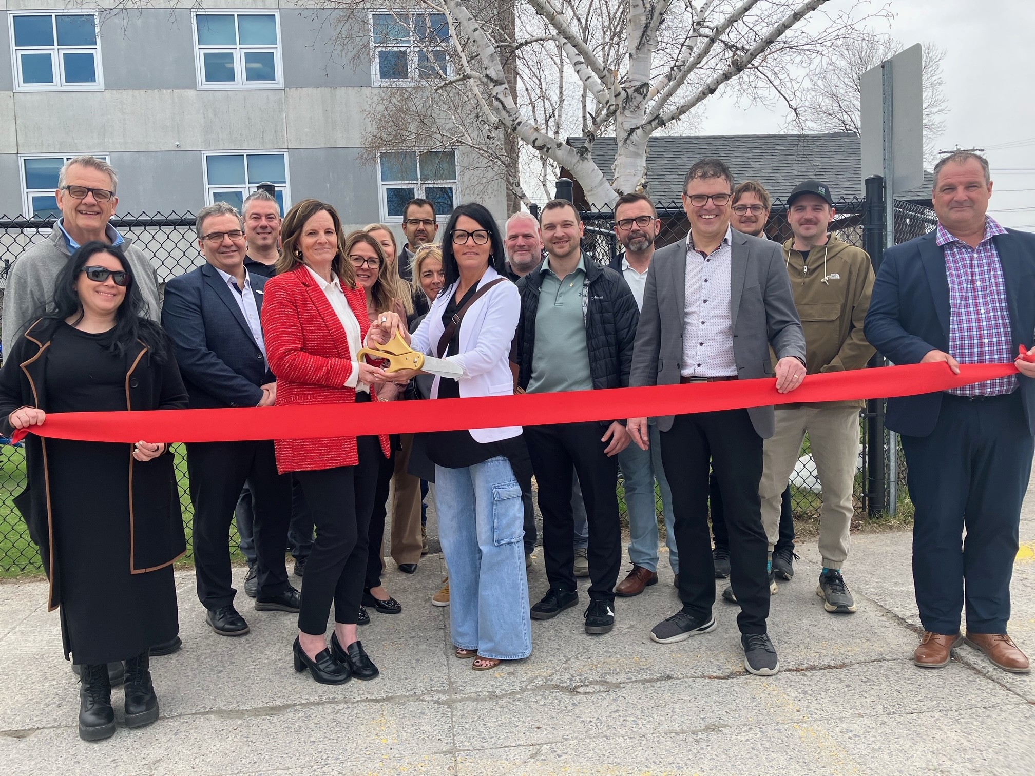 Légende: Geneviève Côté (à gauche) accompagnée de Sandra Maltais (à droite) coupent le ruban, elle sont entourées de M. Marc-Pascal Harvey, M. Éric Girard, Mme Josée Fortin (directrice de l’École secondaire Camille-Lavoie), Mme Annie Larouche, directrice adjointe de l’ESCL, M. Alain Fortin conseiller municipal de Ville d’Alma, M. Dave Corneau directeur du Service des ressources matérielles (CSSLSJ), Marie-Pierre Boivin, technicienne en bâtiment (CSSLSJ) et plusieurs partenaires du projet.
