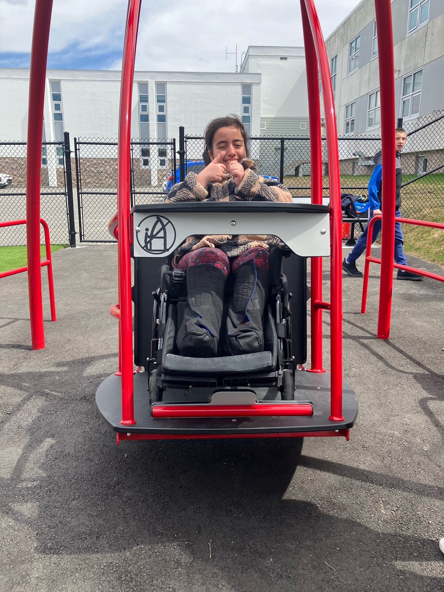 Légende: La souriante Marie-Agélick, élève, qui profite pleinement de la nouvelle balançoire pour fauteuil roulante.